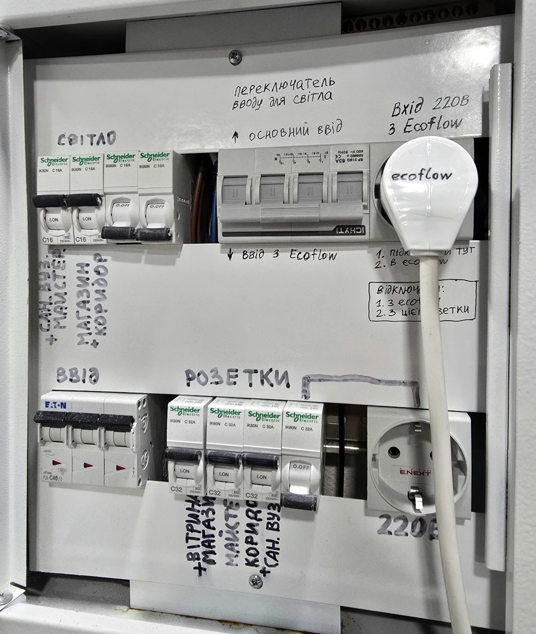До нього подаються два джерела енергії: в нашому випадку це мережа і вихід Ecoflow.